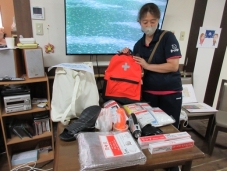 職員が自宅で準備している「持ち出しセット」を見せ、